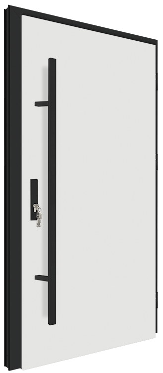 Drzwi zewnętrzne stalowo-aluminiowe do domu bądź mieszkania marki MK-DOOR model 82MK1 Pełne to drzwi dostępne w 7 kolorach: biały, antracyt, orzech, złoty dąb, winchester, dąb turner, antracyt struktura. Kolory dąb turner i antracyt struktura wprowadzone zostały do oferty jako NOWOŚĆ w I edycji katalogu na 2024 rok. Konstrukcja skrzydła o grubości 82 mm i szerokości 90 cm to ramiak z tworzywa sztucznego (PVC) wzmocniony ramiakiem drewnianym, wypełnienie - pianka XPS, uszczelki w skrzydle i ościeżnicy. Ciepła ościeżnica aluminiowa wypełniona materiałem izolacyjnym, pokryta okleiną PVC w kolorze skrzydła z progiem termicznym (od 2022 roku w ofercie także ościeżnica w kolorze czarnym NOWOŚĆ). Skrzydła drzwiowe o grubości 92 mm można skracać od 5,5 do 10 cm za dodatkową opłatą. Drzwi wyposażone są w jeden zamek listwowy (5 punktowy-hakowy firmy WinkHaus), do wyboru w opcji z klamką bądź pochwytem prostokątnym w wersji INOX bądź CZARNYM do wyboru.