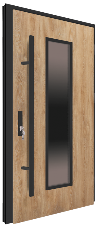 Drzwi zewnętrzne stalowo-aluminiowe do domu bądź mieszkania marki MK-DOOR model 92MK23 to drzwi dostępne w 7 kolorach: biały, antracyt, orzech, złoty dąb, winchester, dąb turner, antracyt struktura. Kolory dąb turner i antracyt struktura wprowadzone zostały do oferty jako NOWOŚĆ w I edycji katalogu na 2024 rok. Konstrukcja skrzydła o grubości 92 mm i szerokości 90 cm to ramiak z tworzywa sztucznego (PVC) wzmocniony ramiakiem drewnianym, wypełnienie - pianka XPS, uszczelki w skrzydle i ościeżnicy. Ciepła ościeżnica aluminiowa wypełniona materiałem izolacyjnym, pokryta okleiną PVC w kolorze skrzydła z progiem termicznym (od 2022 roku w ofercie także ościeżnica w kolorze czarnym). Skrzydła drzwiowe o grubości 92 mm można skracać od 5,5 do 10 cm za dodatkową opłatą. Drzwi wyposażone są w jeden zamek listwowy (5 punktowy-hakowy firmy WinkHaus), do wyboru w opcji z klamką bądź pochwytem prostokątnym w wersji INOX bądź CZARNYM do wyboru. Dostępne wersje przeszklenia: szyba reflex brązowy, szyba mleczna, szyba lustro, szyba lustro weneckie NOWOŚĆ, szyba przezroczysta NOWOŚĆ , szyba grafit, szyba czarna, a także szyba klasy P4. Szyba P4 (dodatkowa opcja dostępna dla wszystkich rodzajów przeszkleń) to szyba zewnętrzna pakietu 3 bądź 4 szybowego, zbudowana z: szyby 4 mm, 4 folii PVB i szyby 4 mm. Szyby grafit, czarna i P4 zostały wprowadzone jako nowość do oferty w II edycji katalogu na 2022 rok, dostępne są na specjalne zamówienie i za dodatkową opłatą.